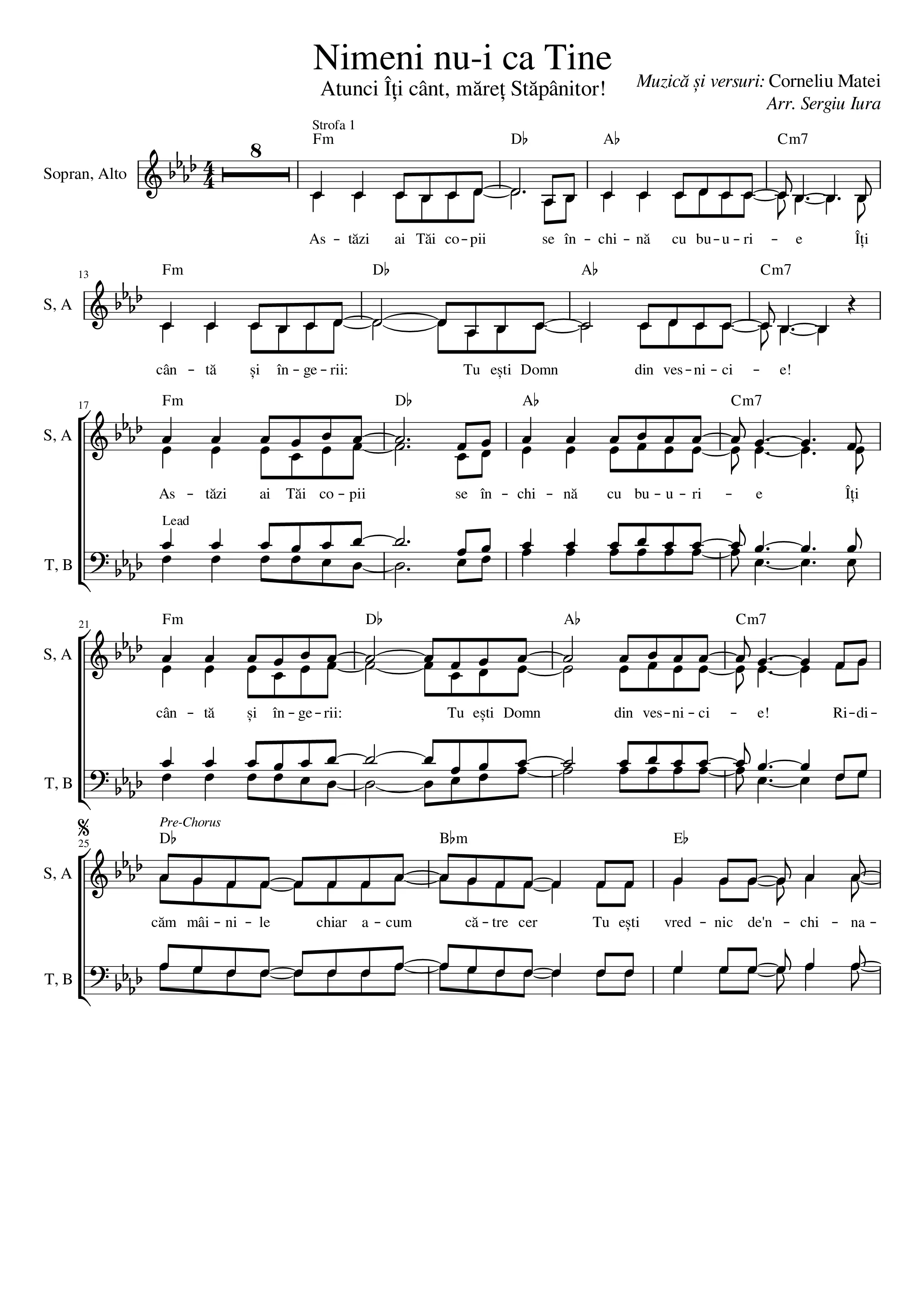 Partitura „Nimeni nu-i ca Tine”, de Sergiu Iura, potrivit pentru cor.